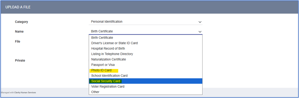 The Coordinated Entry System (CES) team uses personal identification documents to screen clients for eligibility for referrals. Effective date 12.1.2025, users will be required to upload client Photo ID and Social Security Card, or suitable replacements, to the Client Files in the HMIS record. These documents must be uploaded to the Personal Identification Category in Clarity files.